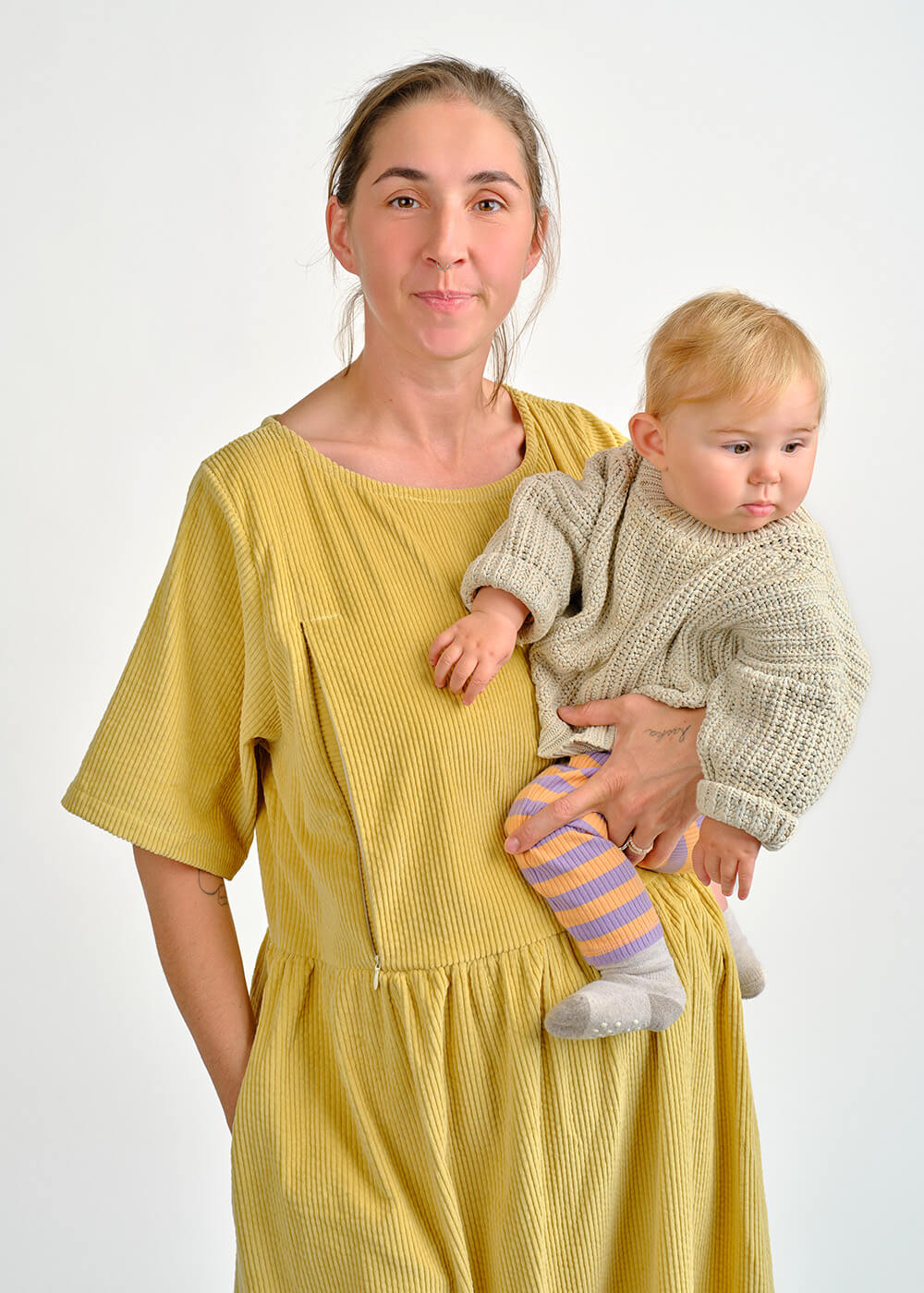 Ušité z poctivého manšestru (100% bavlna), který je příjemný na dotek, hřejivý a drží tvar. Dva diskrétní zipy ti dovolí nakojit v tichu kavárny i na lavičce v parku. Praktické kapsy schovají kapesník, dudlíček i drobnosti, které chceš mít po ruce. Délka ke kolenům je akorát na každý den – do města, na procházku, na návštěvu.