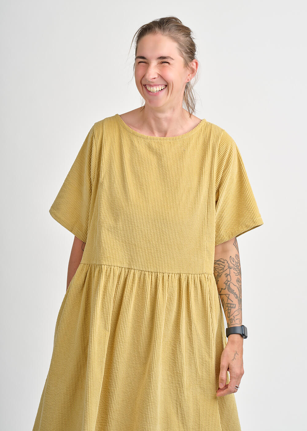 Zemitě žluté Marinette jako podzimní slunce na kůži. Hebký bavlněný manšestr, skryté zipy a kapsy – pro dny, kdy jsi mámou, ženou i trochu vílou.