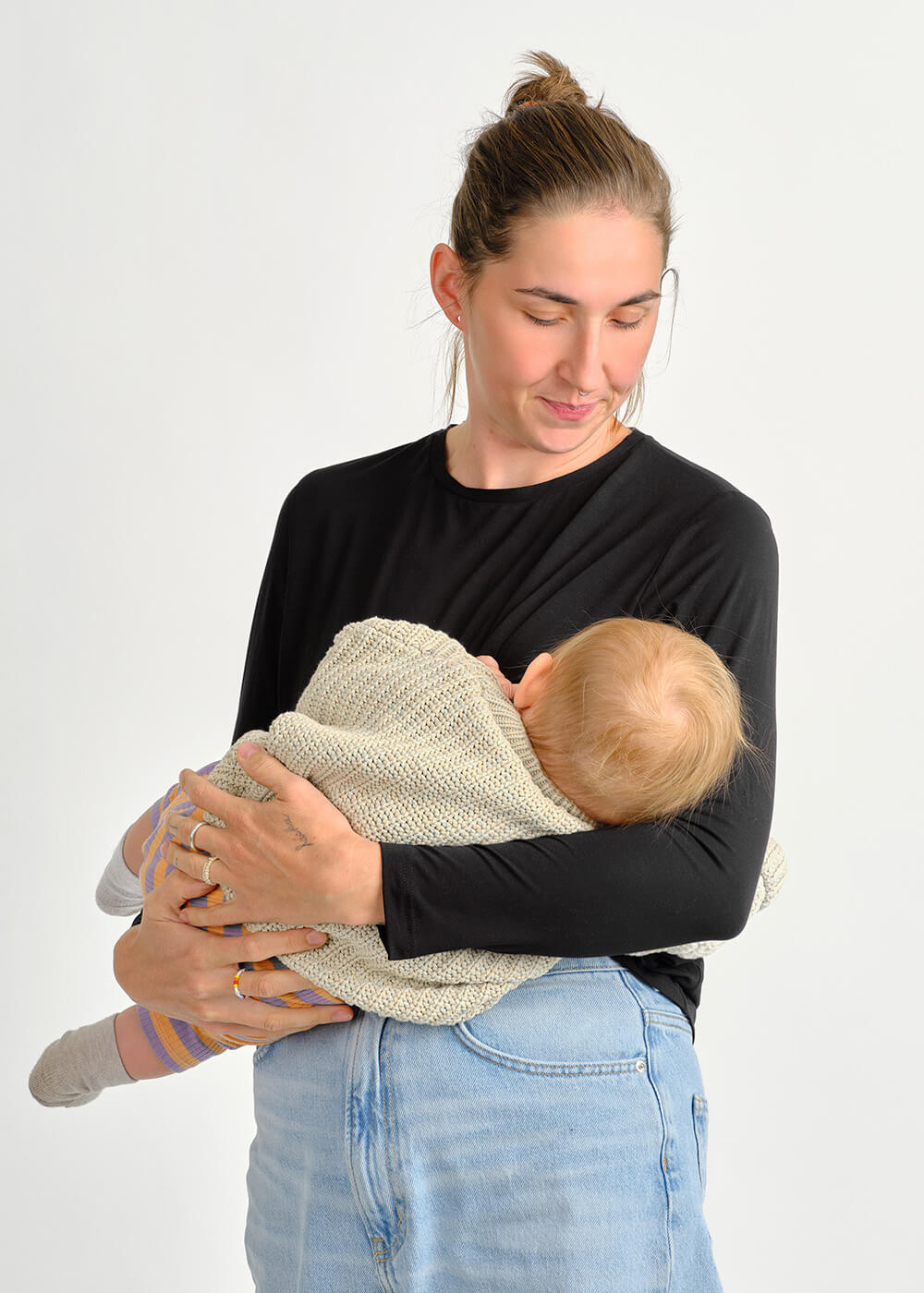 Dva skryté zipy ti umožní nakojit pohodlně a diskrétně, ať jsi doma, na procházce nebo v kavárně. Střih je lehce přiléhavý, aby zvýraznil postavu, ale zůstal pohodlný pro každodenní nošení.