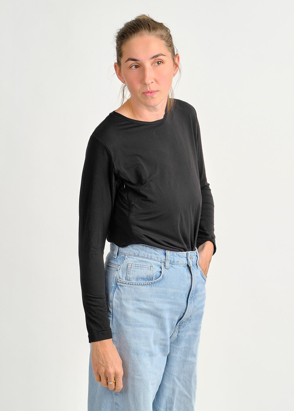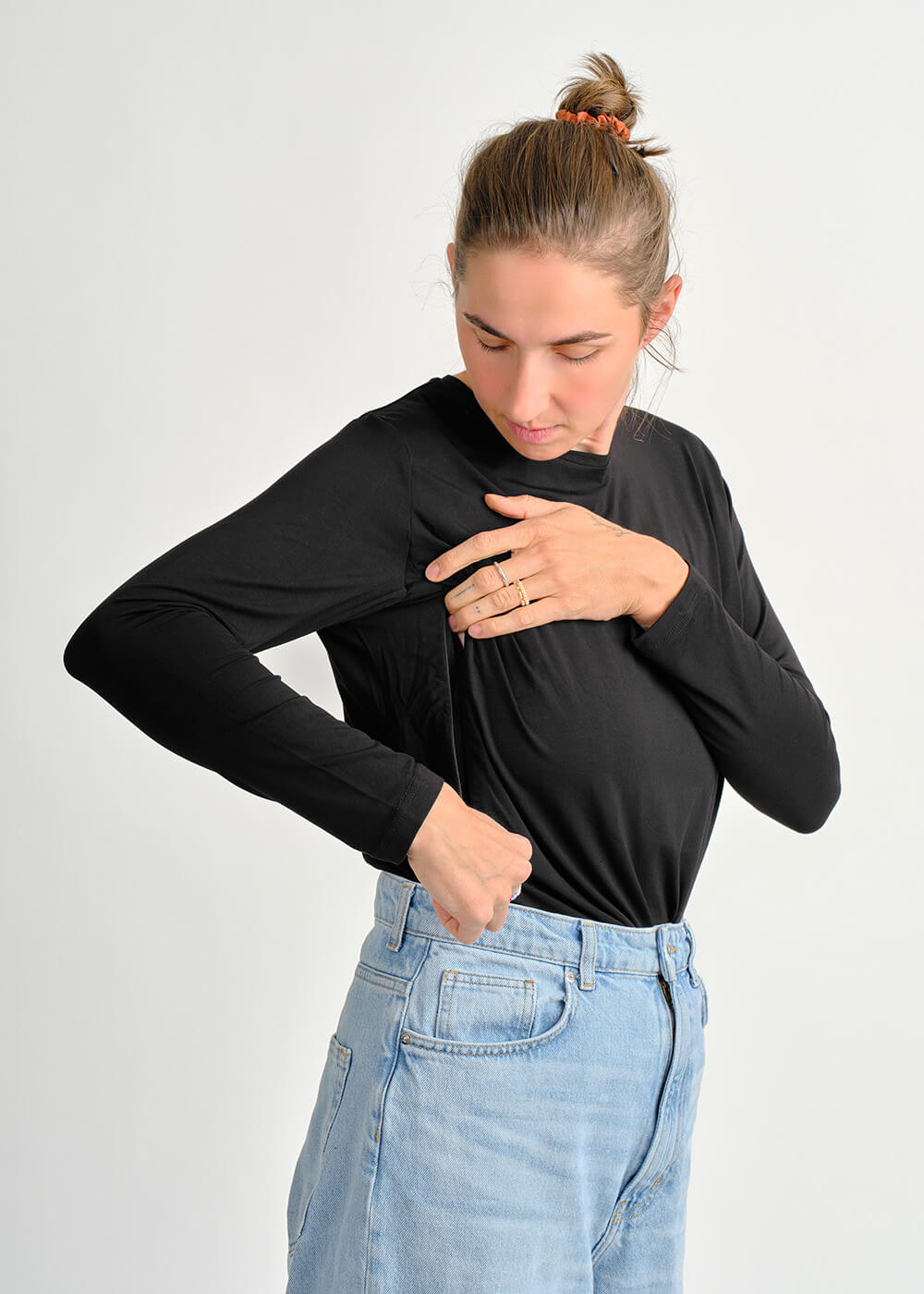 Černé jako klidná noc. Hebké bambusové tričko s dlouhým rukávem, které dýchá, hřeje a dovolí ti nakojit kdykoliv – jednoduše a s lehkostí.