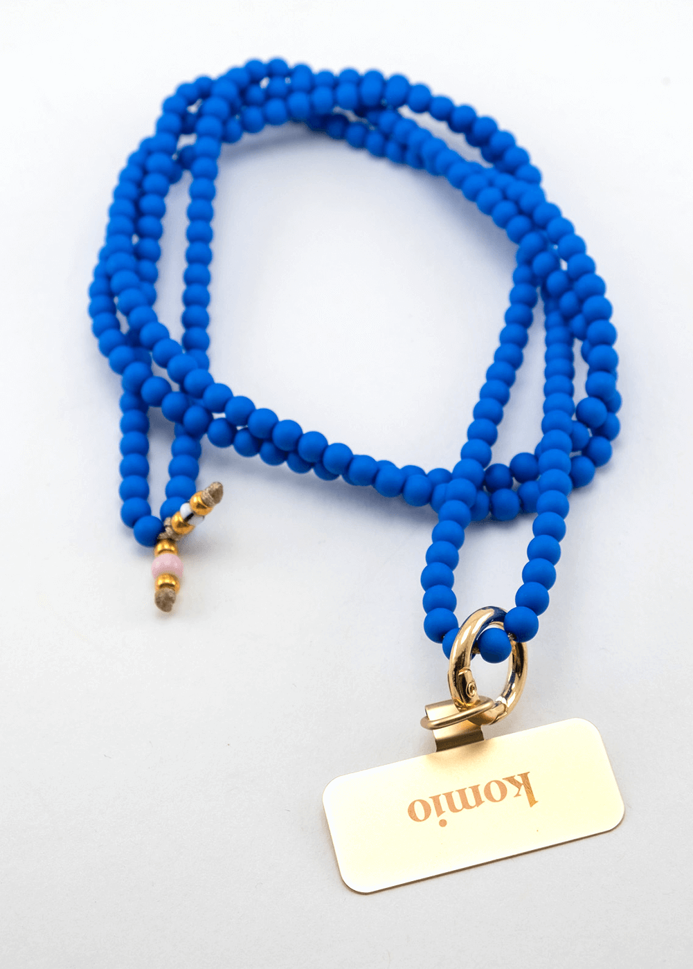 Indigo korálková šňůrka na telefon z české ruční výroby. Nadčasový doplněk, který vypadá skvěle a udrží mobil po ruce.