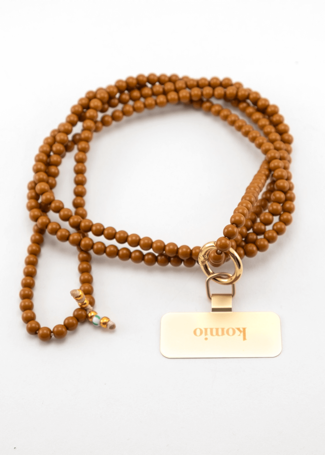 Mocca korálková šňůrka na telefon z české ruční výroby. Elegantní doplněk v neutrálním tónu, který drží mobil bezpečně u vás.
