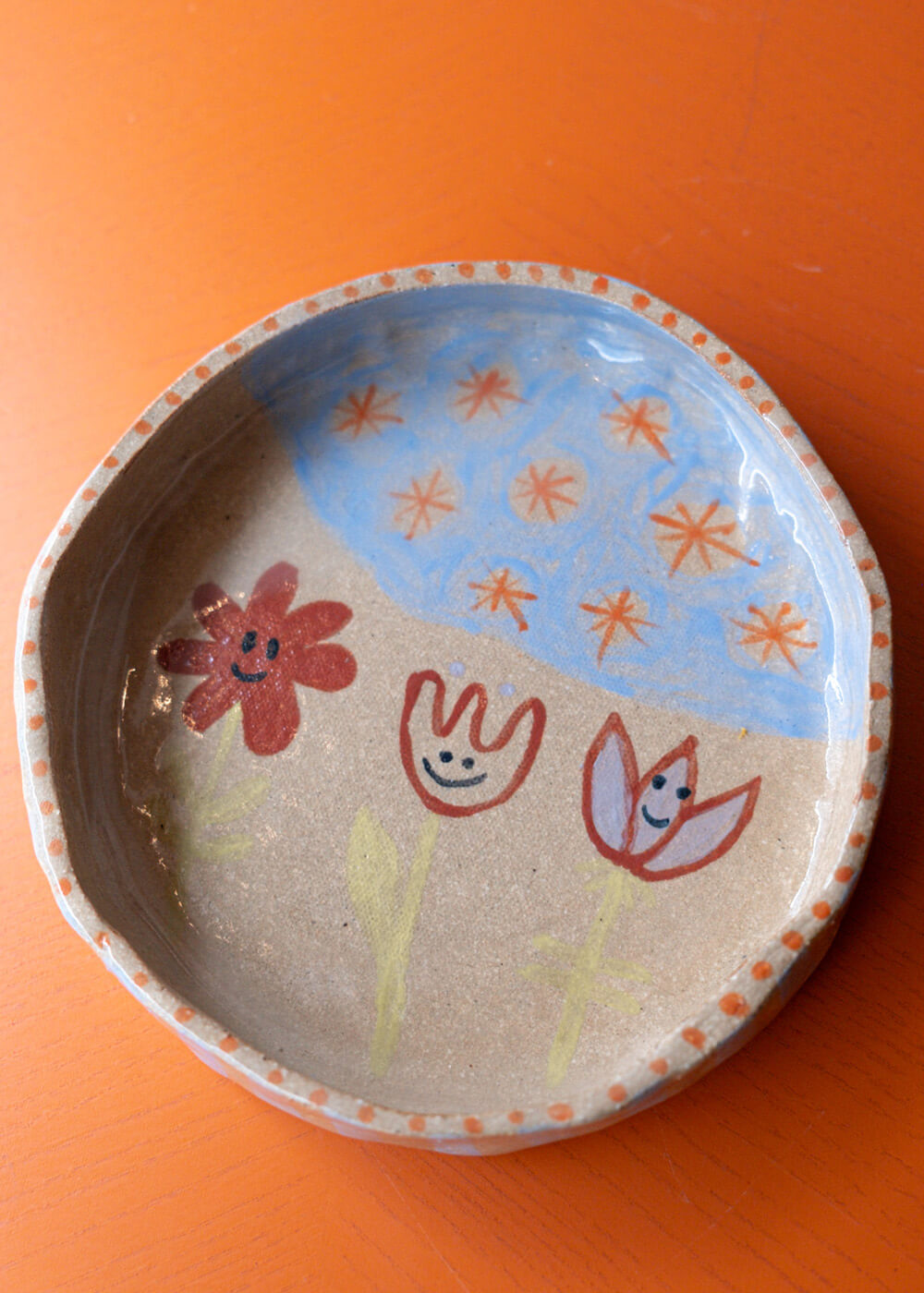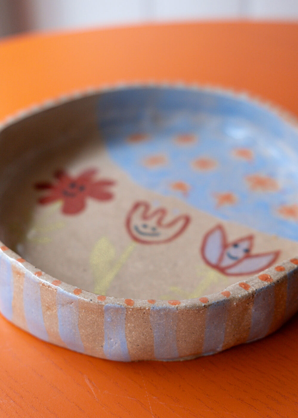 Ručně vyrobený keramický talířek s malovanými kytičkami a drobnými tvářemi, které mu dodávají hravost a lehkost. Každý detail vznikal pomalu, s citem a radostí z kresby. Originální kousek vytvořený rukama Terezy Švejdové. Existuje pouze jeden jediný kus.